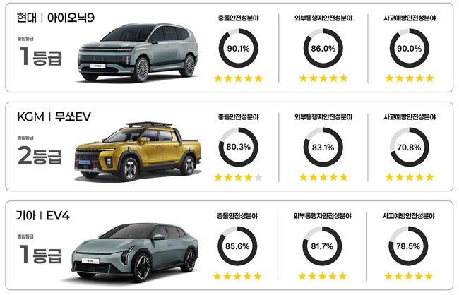 국토교통부와 한국교통안전공단 자동차안전연구원은 2025년 자동차안전도평가(KNCAP) 종합평가 결과, 현대 아이오닉9·팰리세이드·넥쏘와 기아 EV4가 충돌·보행자·사고예방 안전성에서 모두 높은 점수를 받아 1등급을 획득했다고 17일 밝혔다.국토교통부와 한국교통안전공단은 올해 전기차 6종, 하이브리드차 2종, 내연기관...