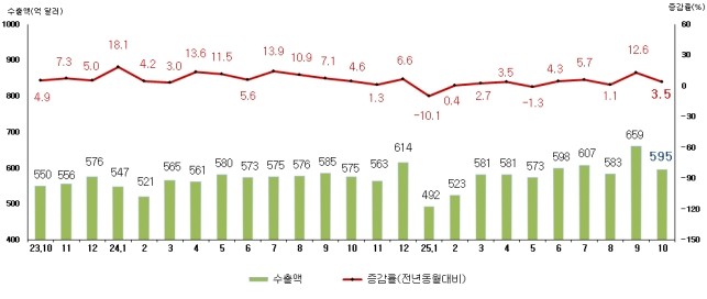 10월 수출 595억 달러…5개월 연속 증가 이어가며 무역수지 60억 달러 흑자