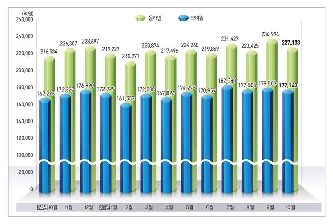 2025년 10월 온라인쇼핑 거래액이 전년 같은 달보다 4.9% 증가한 22조 7,103억원을 기록했으며, 모바일 거래 비중은 78%로 확대된 것으로 나타났다.